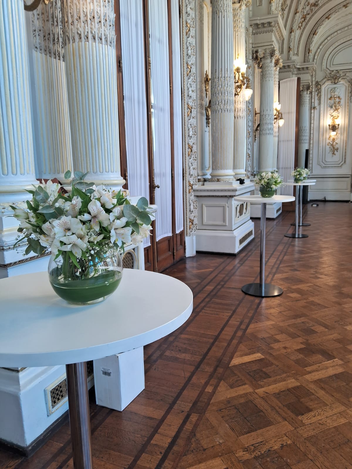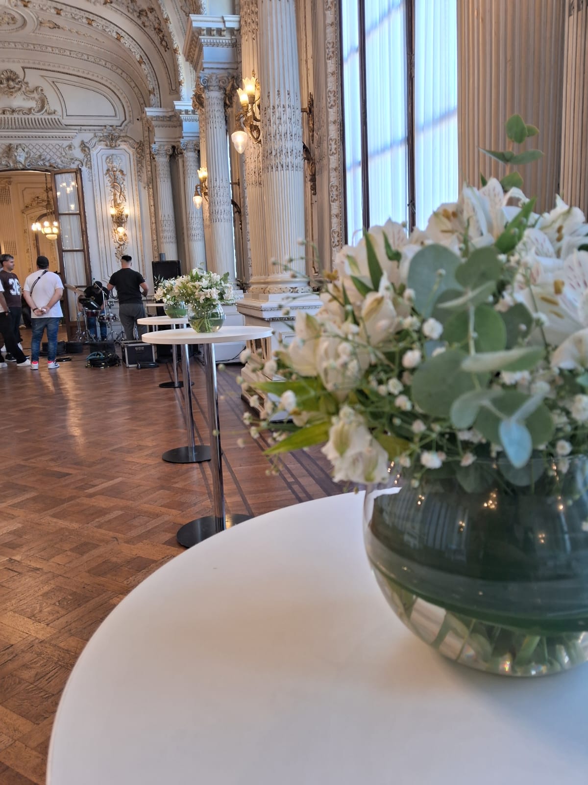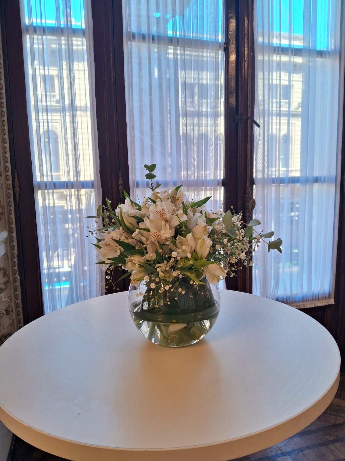 Florero pecera con astromelias, gisofilia y eucalipto