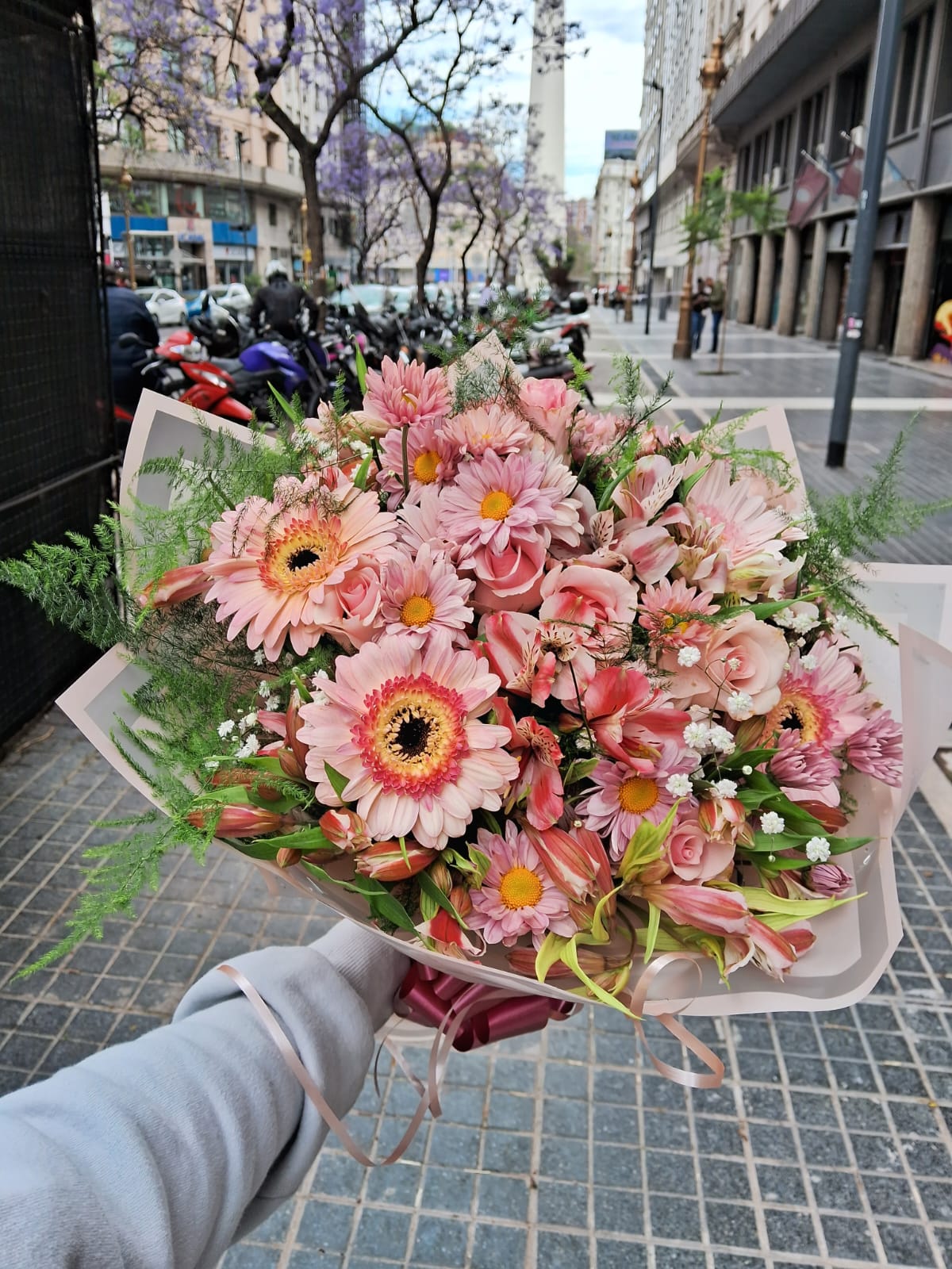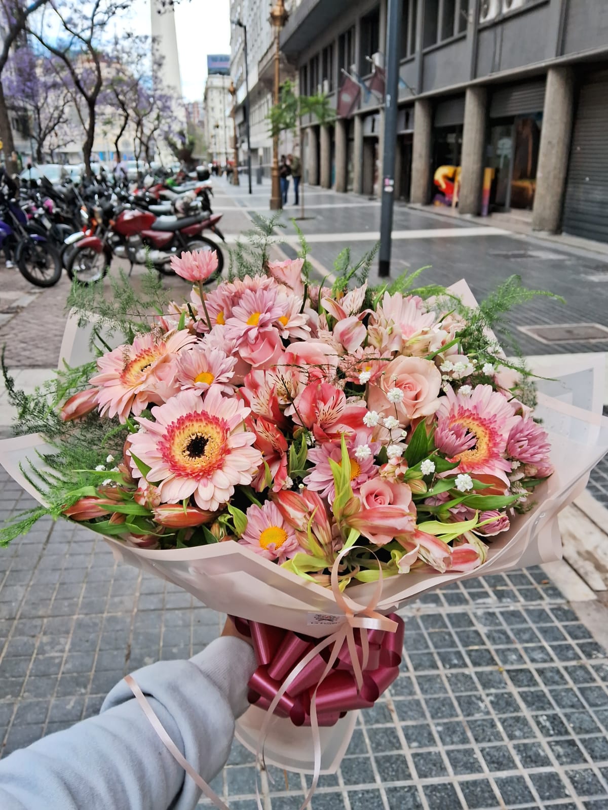 Trae un mix rosado margaritas, astromelias, gerberas, rosas y Gipsofila.